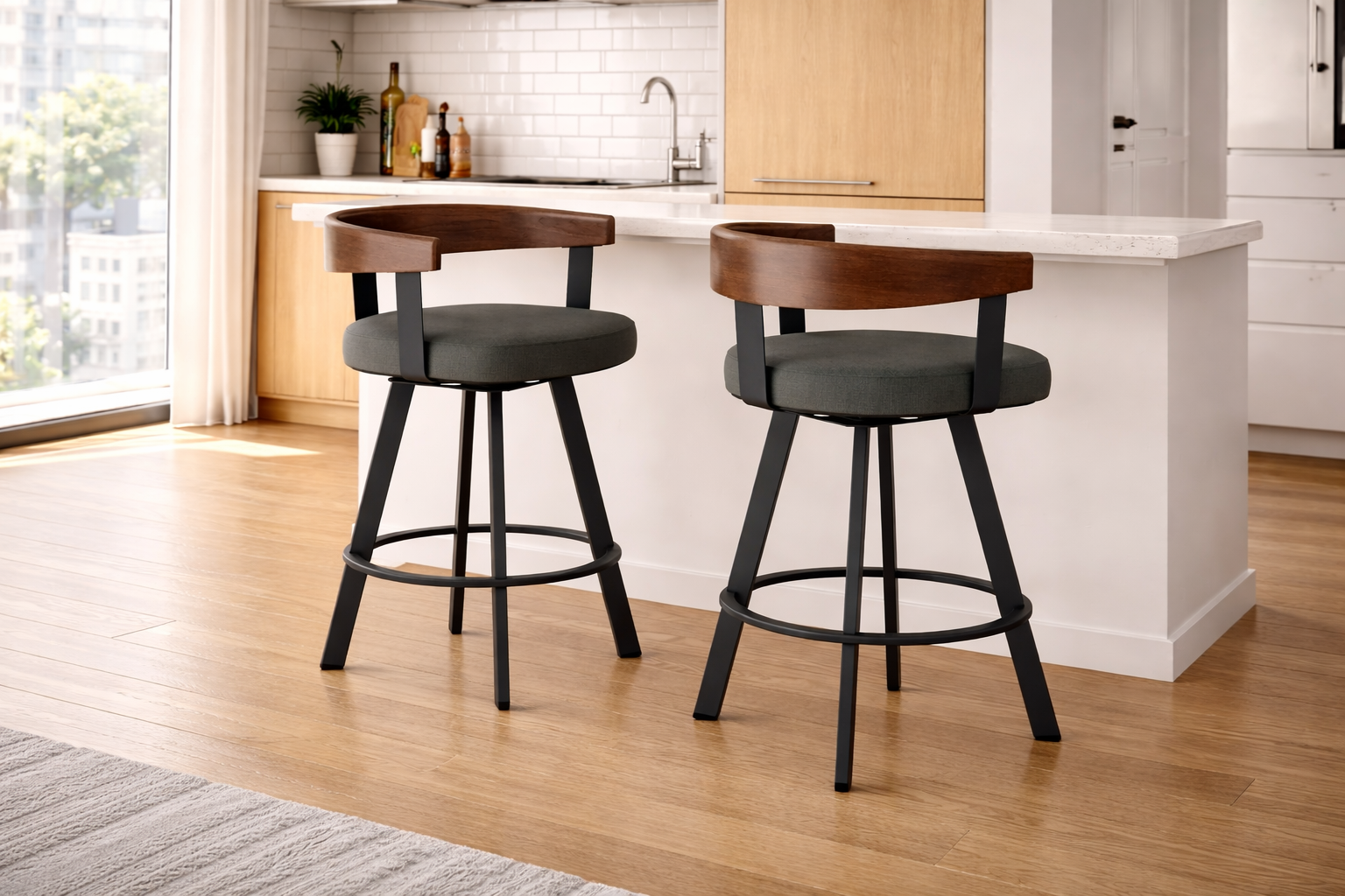 Taburete desayunador para cocina o bares, estilo elegante y moderno, te encantará la fusión entre la madera y el metal, dale el toque de elegancia que estabas buscando en tu hogar. Color de tapices y madera personalizables