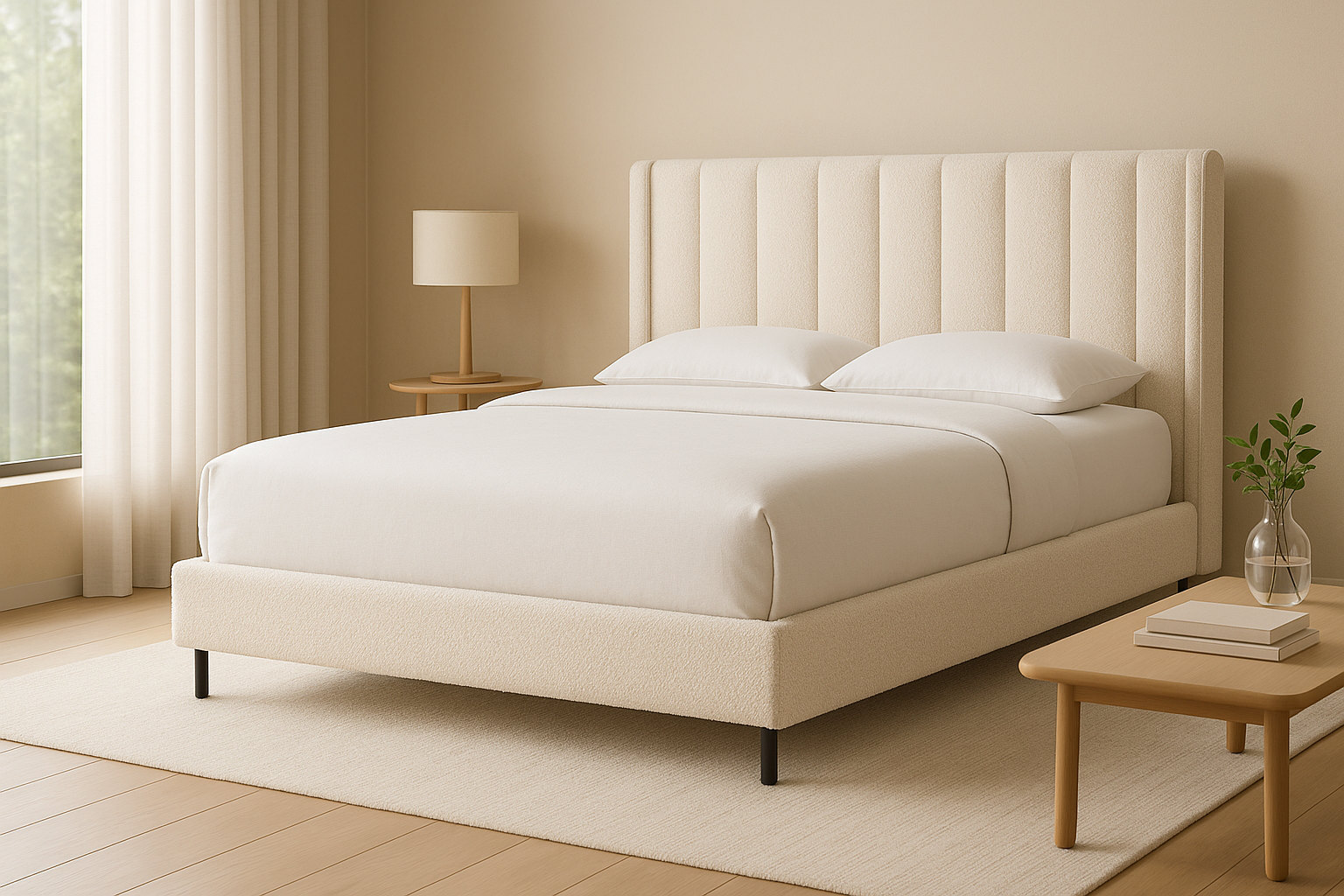 La Cama Alice combina elegancia y confort en un diseño tapizado con espaldar acanalado y patas de madera. Su estilo minimalista realza la armonía y sofisticación del dormitorio.