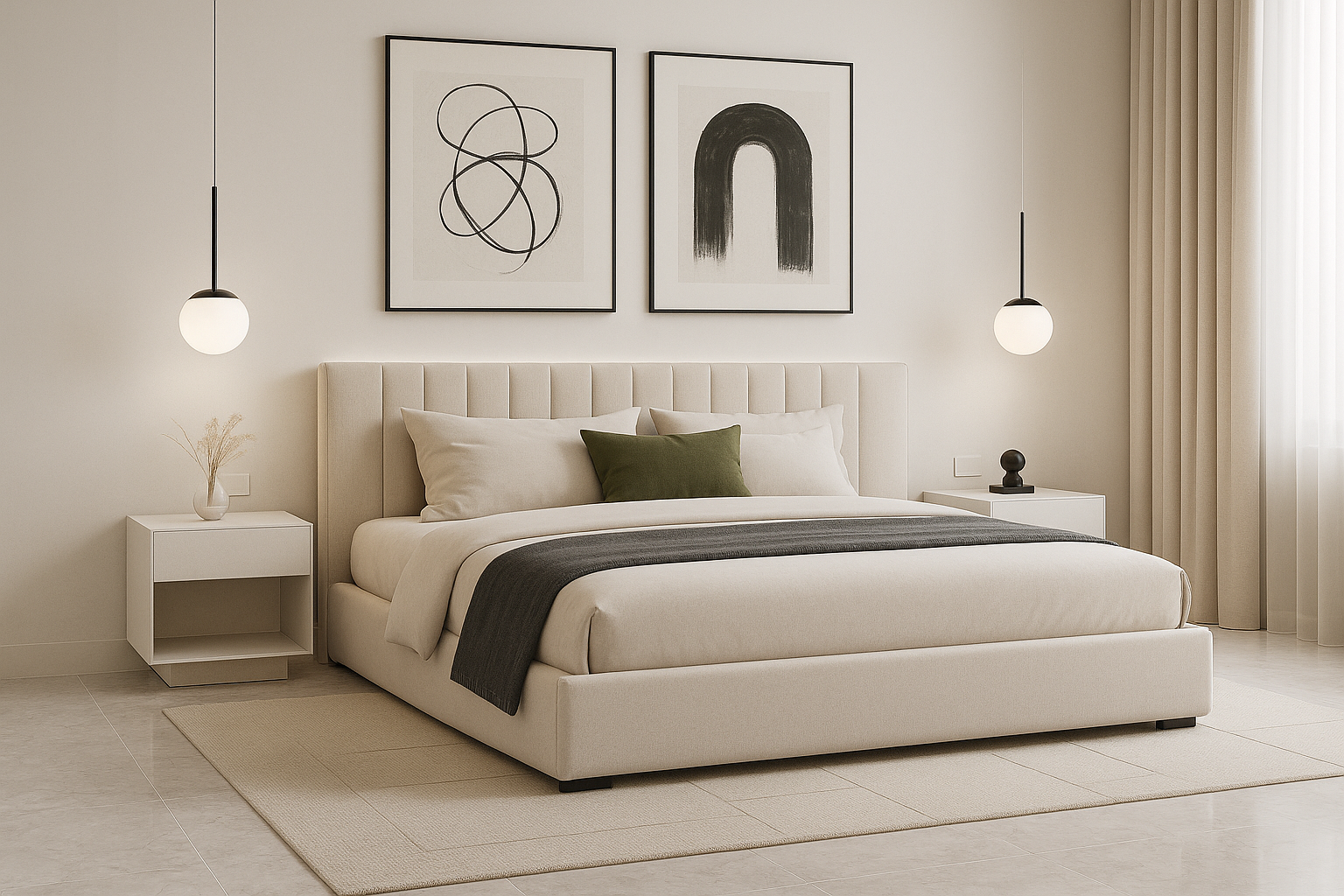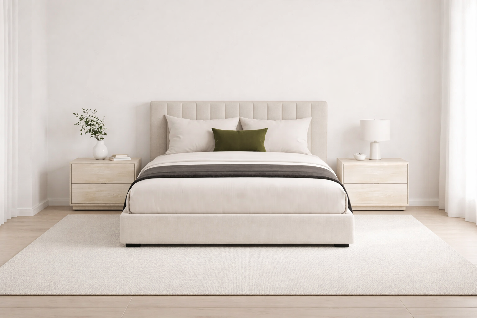 Más que una cama, la Cama Lys es una declaración de confort contemporáneo. Su tapizado suave y su espaldar vertical aportan una sensación de calidez y profundidad visual, mientras las patas de madera introducen un toque natural que eleva la estética de cualquier ambiente.