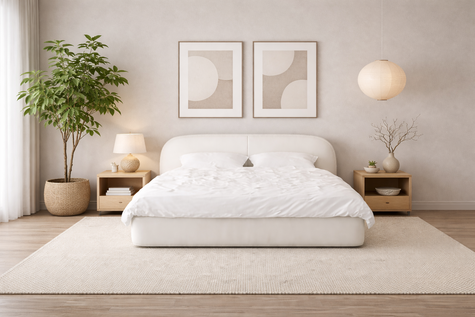 Cama Shizen de diseño contemporáneo, diseño curvo tapizado, que aporta elegancia y calidez al espacio.