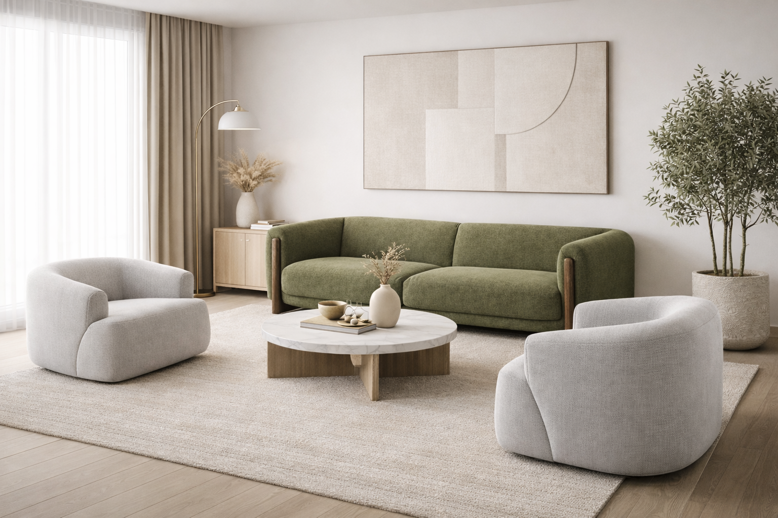 Diseño contemporáneo y confort envolvente en un sofá minimalista con base de madera y poltronas equilibradas.