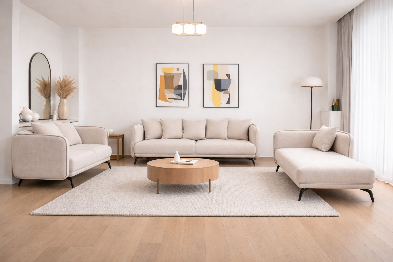 La Sala Nara está diseñada para transformar tus espacios con su diseño sofisticado, materiales de alta calidad y un confort inigualable, incluyendo un amplio Chaise longue ideal para relajarte. la Sala Nara es la elección perfecta para cualquier hogar moderno.