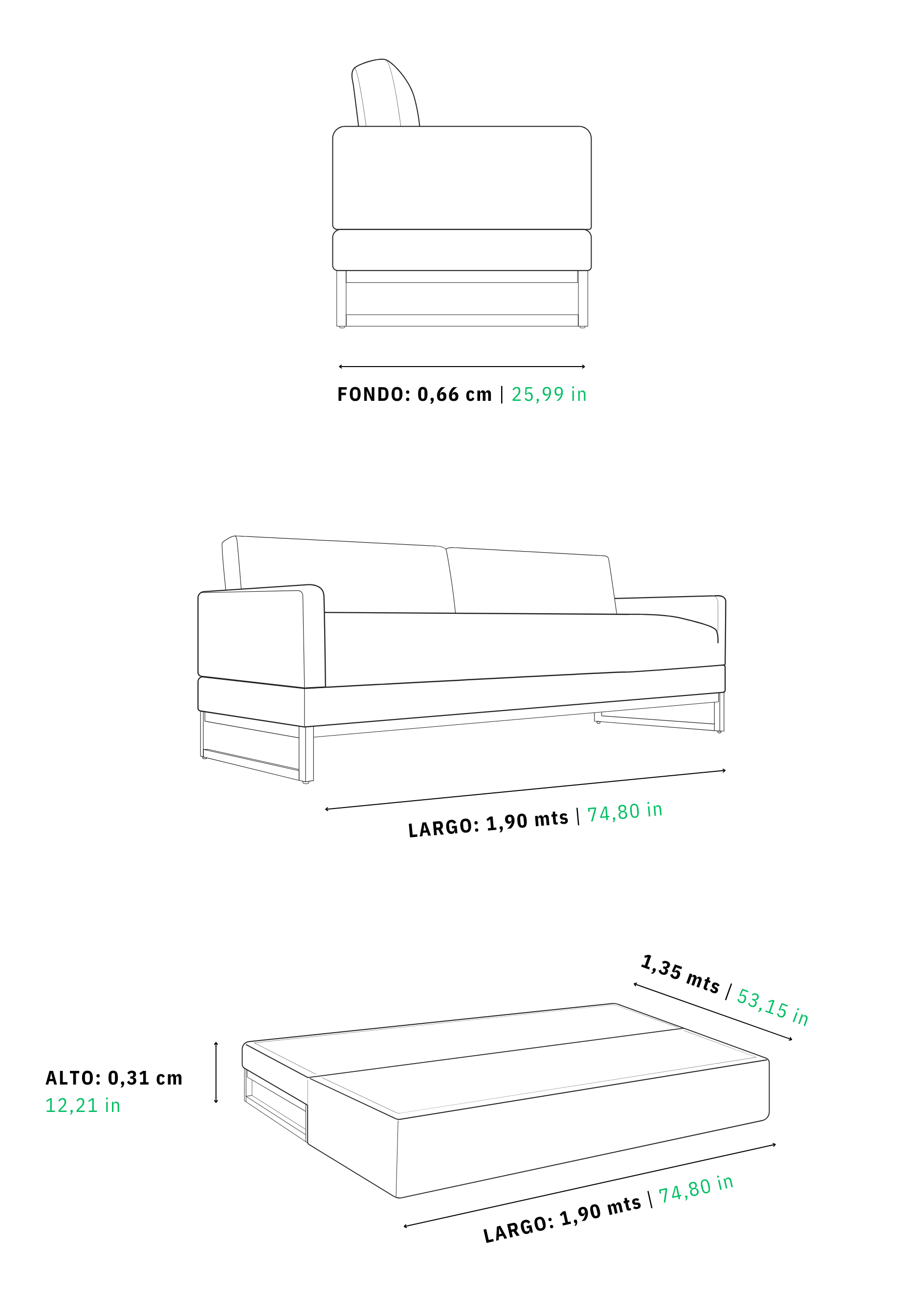 Más que un sofá, esta pieza revela una doble vida: durante el día, sus líneas limpias y base de madera visible definen un ambiente contemporáneo; por la noche, se despliega sin esfuerzo para convertirse en una cama de dos plazas, ofreciendo una superficie amplia y cómoda.