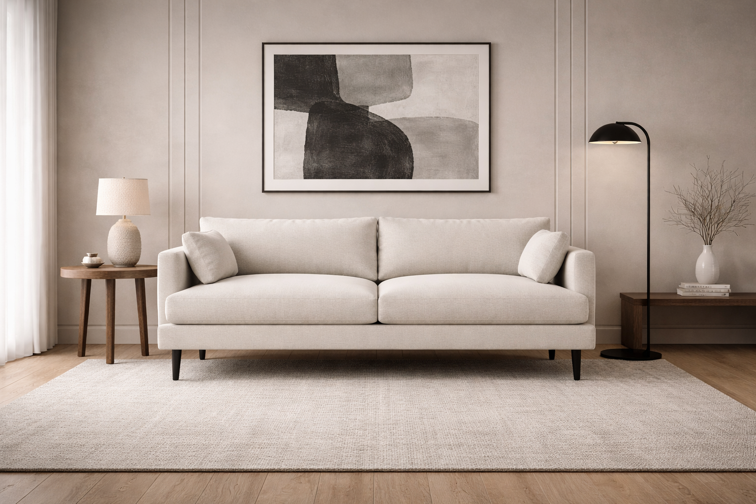 Sofá de diseño moderno con tapizado premium y líneas depuradas, ideal para salas elegantes que buscan comodidad y estilo contemporáneo.