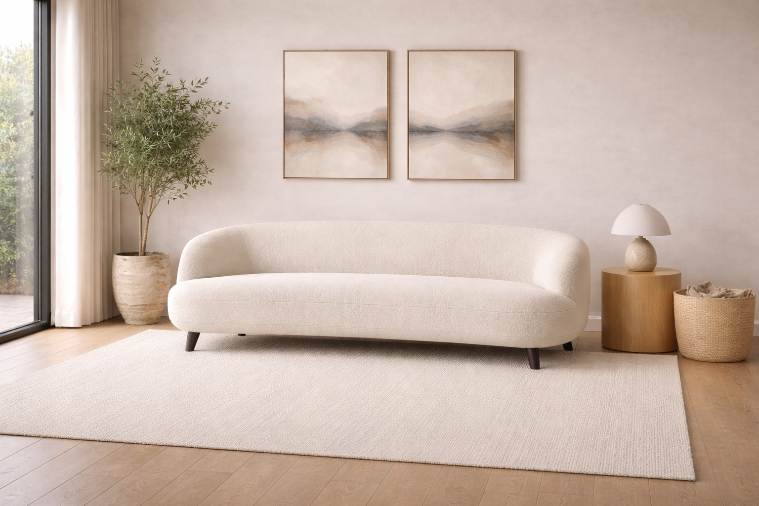Sofá de líneas suaves y diseño contemporáneo que transmite equilibrio y elegancia, tapizado en telas de alta calidad, ofrece una experiencia de descanso superior y un estilo sobrio atemporal.