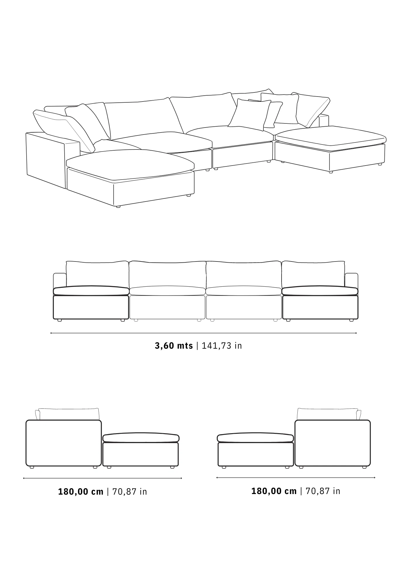 Gracias a su ingenioso diseño puedes utilizarla como una sala de gran tamaño, incluye módulos adicionales que pueden ser configurados como Chaise longue o incluso se puede transformar en una cama de gran tamaño para huéspedes, simplemente moviendo algunos módulos y ajustando los cojines, se logra una superficie uniforme y espaciosa para dormir para disfrutar de una experiencia de descanso excepcional.